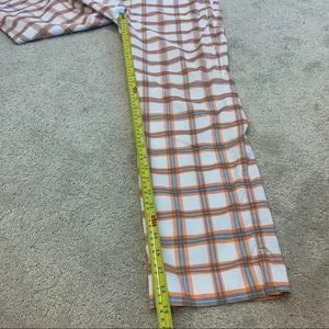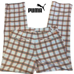 Puma straight leg pants in a plaid pattern. Features white base with orange and brown plaid lines and subtle blue accents. Belt loops and back welt pockets. Clean, bold graphic plaid design.