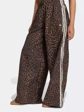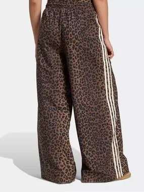 Adidas wide-leg track pants with a brown leopard print. Soft, flowy fabric with an elastic waistband for comfortable all-day wear. Signature side stripes and subtle Adidas logo add sporty detail. Pair with a fitted top or sneakers for a chic casual look.