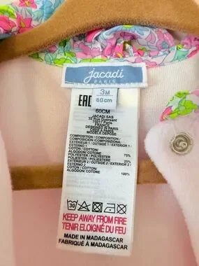Soft pale pink footed one-piece onsie from Jacadi. Floral ruffle collar adds bright, playful spring/summer touch. Front snap closure for easy dressing. Cozy, soft, velour fabric for comfortable wear.