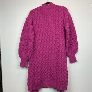 Rich fushia-purple textured knit open-front cardigan by Pink Martini. Features an intricate cable and openwork knit throughout, relaxed open silhouette, ribbed cuffs and hem, and a knee-length cut that is more duster than cardigan. Soft, lightweight feel with substantial visual texture — cozy without bulk.