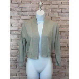 This Calvin Klein cardigan showcases a sophisticated silver metallic finish that catches the light beautifully. The cropped design features long sleeves, ribbed trim details, and an open front styling that creates an elegant layering piece.