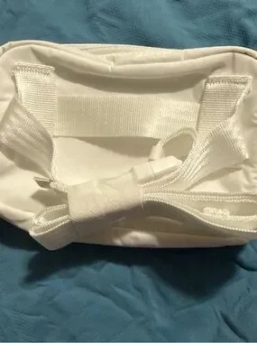Compact white crossbody pouch by Athleta. Clean silhouette with subtle logo on front. Zippered top keeps items secure. Adjustable strap for hands-free wear. Smooth finish that pairs with casual looks.