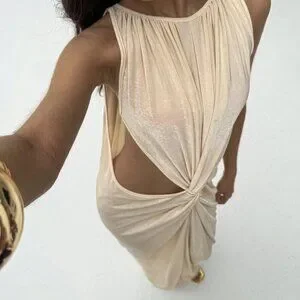 Turn heads with this apricot elegant maxi dress, designed with a sleeveless cutout silhouette and a round neck. A high waist and regular fit create a flattering fitted shape, while the slit hem adds movement and allure.