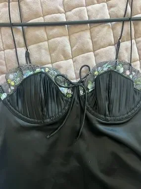 For Love & Lemons Black Satin Slip Dress with Lace Trim