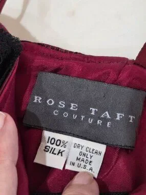 This stunning Rose Taft Couture vampy gown reflects the timeless elegance of vintage fashion. The rich red silk and intricate black lace details evoke a glamorous, bygone era. The mermaid hem and spaghetti straps enhance its sophisticated silhouette, making it ideal for formal occasions.