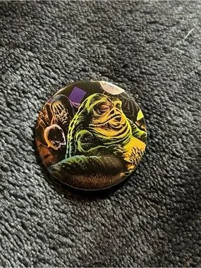 Handmade 1.25” button featuring Jabba the Hutt, created from a repurposed comic book.
