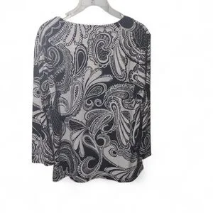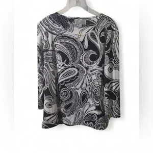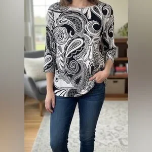Elevate your wardrobe with this elegant 3/4 sleeve blouse featuring a striking black and white paisley design. Perfect for any occasion.