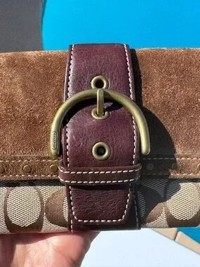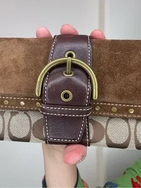 Coach SoHo Signature Studded Buckle Flap Clutch/Wallet, featuring brown suede and tan signature monogram canvas.