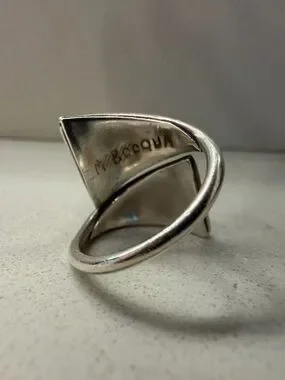Bold turquoise and coral inlay ring with geometric design. Sterling silver wrap band for an adjustable fit. Vibrant blue-green and warm red tones create a striking contrast. Perfect statement piece to elevate everyday or special occasion looks. Antique signed and tamped piece, size 7