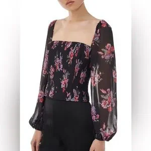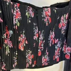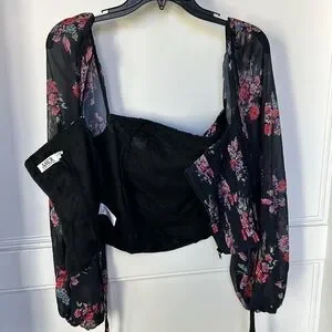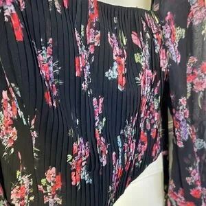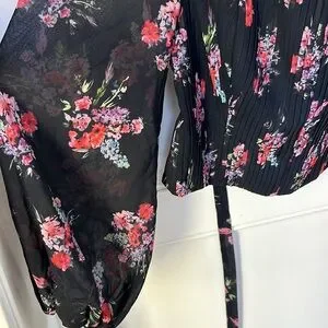 Beautiful top. Sheer long sleeves. Black color. Multicolor floral print. Pleated corset design. Zippered back.