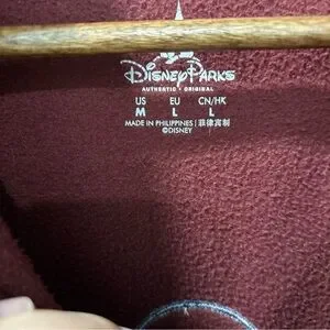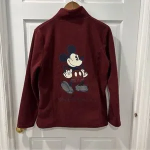 Disney Parks full zip fleece jacket with Mickey Mouse appliqué design, women’s size medium. This jacket is a burgundy color with Mickey Mouse embroidered left chest and with an appliqué Mickey on the back with Walt Disney World written underneath. The jacket is in good condition, no wear or flaws. 100% polyester