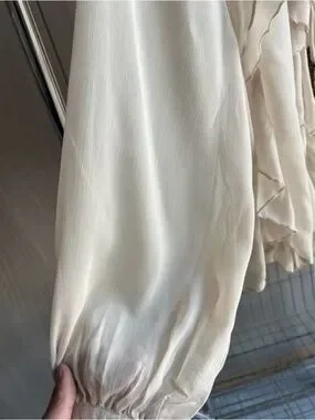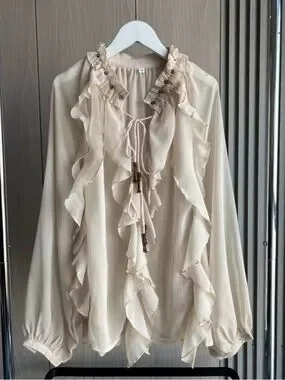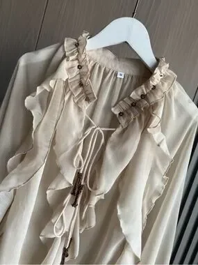 Elegant cream blouse with cascading ruffle details and a tie-neck closure. Lightweight, flowing fabric for a polished, feminine look. Long sleeves with gentle elastic cuffs for comfortable wear. Perfect for work or dressy occasions.