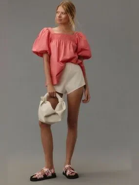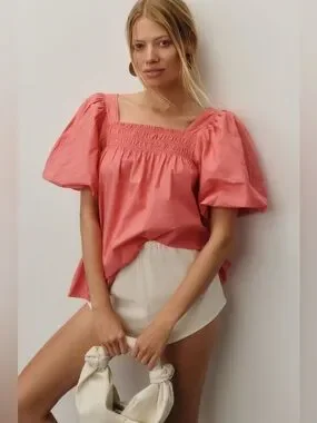 Coral square neckline with smocked detail. Voluminous puff sleeves for a bold silhouette. Lightweight, airy fabric with a relaxed fit. Feminine coral tone ideal for warm-weather looks.