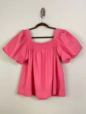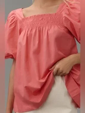 Anthropologie Maeve Coral Pink Puff-Sleeve Smocked Blouse Size Medium