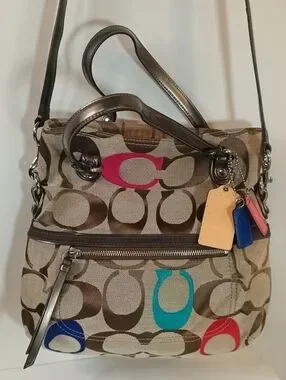 Y2K VINTAGE 90S Stylish multicolor logo-pattern shoulder bag. Features a beige canvas body with colorful logo accents for a modern look. Versatile design with an adjustable strap for comfortable wear. Perfect for everyday use and casual outings. extra coach charms , this bag in in excellent used condition!