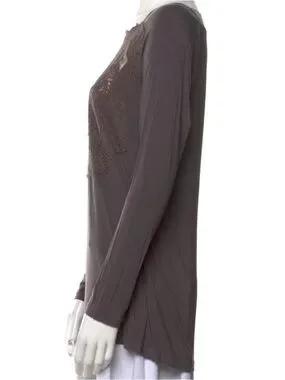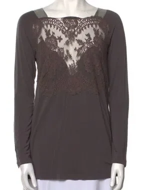 Long-sleeve La Perla top with a sheer lace yoke. Soft, drapey body fabric for comfortable wear. Feminine lace detailing across the chest. Versatile piece for day or evening styling.