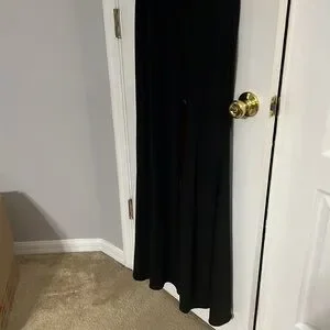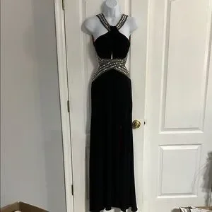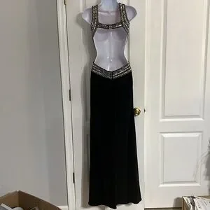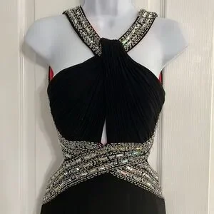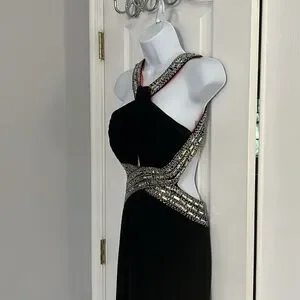 This stunning black gown by Adam features a sophisticated halter neckline and a daring backless design, perfect for prom or cocktail events. The dress showcases elegant cut-out details, creating a striking silhouette that flows into a sleek, floor-length skirt. Its timeless black color adds a touch of classic elegance to any formal occasion. Worn once to a formal event.