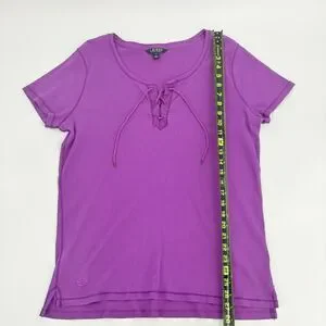 Vintage Lauren Ralph Lauren Blouse Top Tee Shirt Lace Up Tie Front Purple Rib Knit Y2K DIstressed Preppy Cap Sleeve