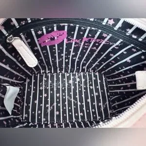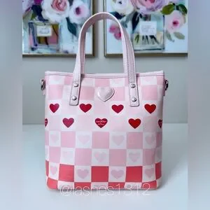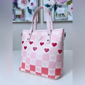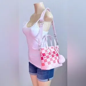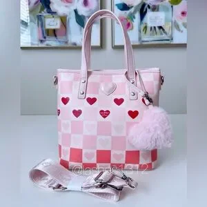 Stylish pink checker tote with heart accents. Soft pink color and red heart details add playful charm. Comes with a removable fluffy pink pom charm and matching strap for versatile wear. Lightweight, polished finish for everyday use.