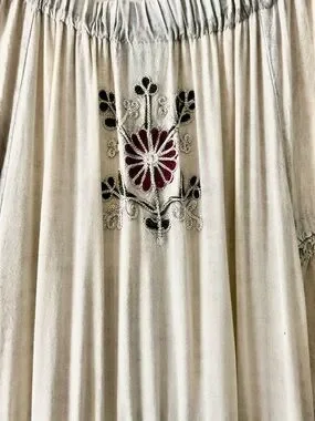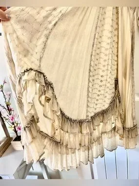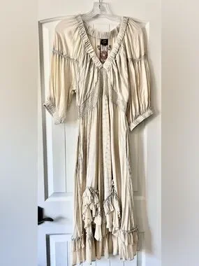 Free People cream maxi dress with a deep V-neck and tiered ruffle hem. Smocked and gathered details for a flattering, relaxed fit. Lightweight fabric and three-quarter sleeves create easy, all-day comfort. Perfect for casual outings or layered looks.