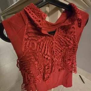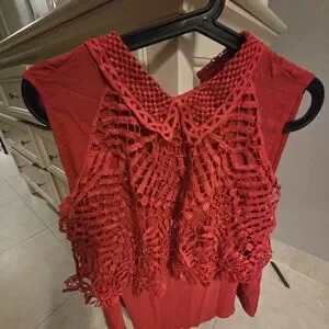 Stylish red sleeveless top with a crochet lace overlay for a feminine, textured look. Lightweight and breathable fabric perfect for layering or warm-weather wear. Versatile design that pairs well with jeans, skirts, or shorts. Machine washable for easy care.