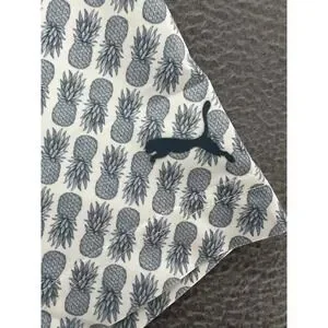 Puma golf polo shirt features a vibrant all-over pineapple print in a classic white and grey colorway. Designed for performance and style, this short-sleeve top includes a two-button placket, a crisp collar, and side-slit hems for ease of movement. The iconic cat logo is prominently displayed on the left sleeve, making it a perfect choice for the green or casual tropical-inspired outings.