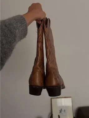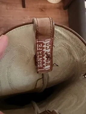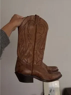 classic cowboy boot styling. smooth tan leather shaft with subtle stitching. brown leather pull strap with woven logo detail.