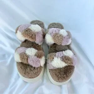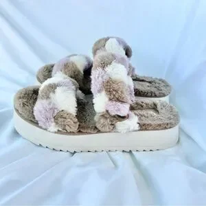• Grounded in a soft, faux fur topsole and splashed with color-blocked hues, this sumptuous slide affords indoor/outdoor versatility with a durable EVA outsole. 1.5" platform height.