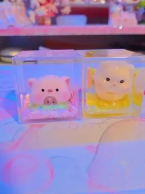 Adorable pink pig small pet figurine presented in a clear display cube. Soft pink color with delicate blush details. Decorative and collectible for pet-themed displays and gifts.