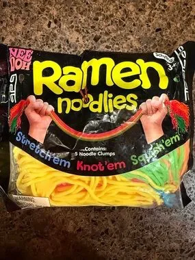 Vintage-style Ramen Noodles toy pack with bright yellow, red and green noodle strands. Fun stretchy, knot and squish play. Bold graphic packaging on front.
