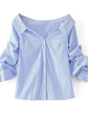 Off-shoulder button-down blouse with narrow blue and white stripes. Long ruched sleeves for a relaxed fit. Light, breezy fabric for everyday wear.