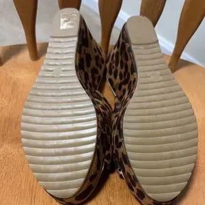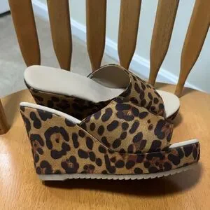 Stylish leopard print slide sandals in brown. Soft cushioned footbed for all-day comfort. Wide leopard-pattern strap for a secure fit. Versatile brown design that pairs with casual and dressy outfits.