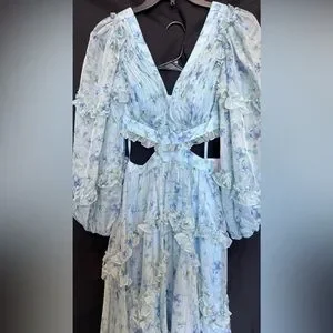 Crafted from luxurious chiffon, this A-line gown is designed to captivate. The low back and plunging neckline exude sophistication, while the romantic ruffles and floral embellishments add a feminine touch. With its long and puff sleeves, this dress is perfect for those who love drama. Whether it's a special event or a night out, this stunning dress is a must-have for those who want to look their best. 💫💕