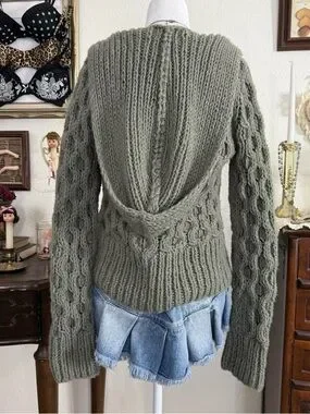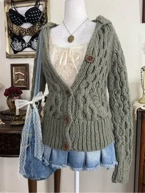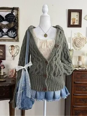 y2k cozy fairy grunge boho twee sage green chunky knit hooded cardigan w pockets