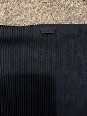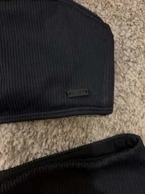 Roxy Love The Ribbed Chloe V-Notch Bikini Set in black. This is a two-piece swimsuit with a ribbed texture throughout. The top features a v-notch neckline and the set comes as a complete matching pair.