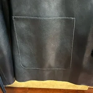 Sleek black leather jacket with fringe detailing across chest and sleeves. Button-front closure and notch collar. Clean lines for a modern, edgy look.