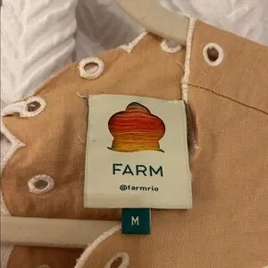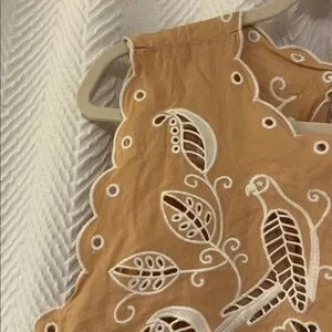 Lightweight tan cotton crop top with white embroidered cutwork details. Features scalloped hem and floral-bird embroidery for a feminine, airy look. Easy to style for warm-weather outfits.