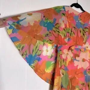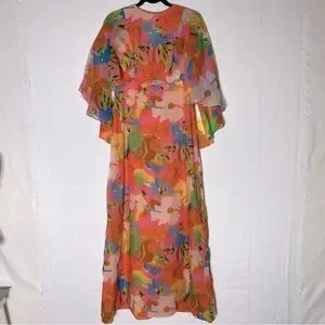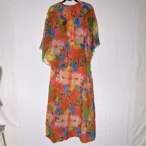 Vintage 60’s 70’s Orange Pink Blue Floral Capelet Chiffon Maxi Dress M Boho Psychedelic Hippie Luxe Retro Flowery Flower Power Mid Goddess Fairycore Ethereal Luxe Boho Prairie Festival