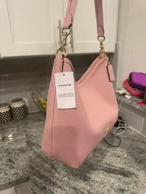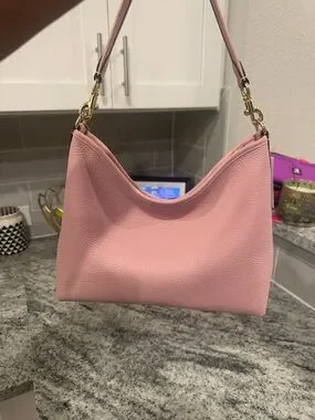 Soft pink pebble leather shoulder bag by Coach. Gold-tone hardware and logo plaque. Single top handle with detachable clips. Smooth zippered opening and minimalist silhouette. Elegant, everyday carry piece.