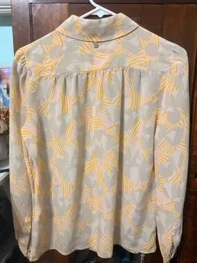 Tory Burch long-sleeve button-down with an abstract gray, beige and yellow print. Lightweight 100% silk fabric with a classic collar. Button-front closure and softly gathered shoulders. Easy to style for casual or polished looks. Absolutely gorgeous, size 4