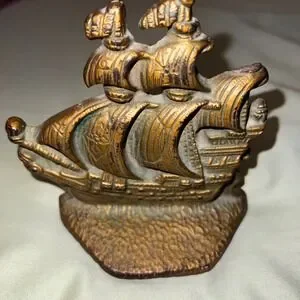 Vintage Cast Iron Pirate Ship Galleon Bookend Doorstop Nautical Bronze Tone 4.5"