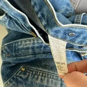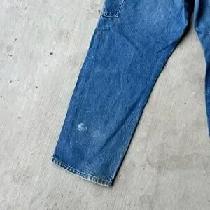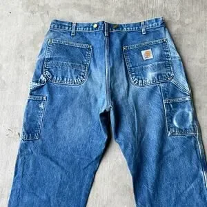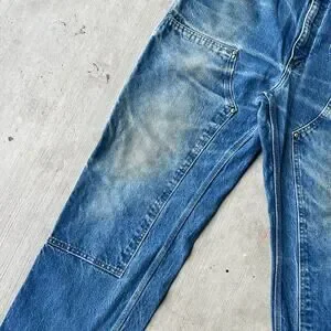 Carhartt faded denim blue jean double knee work wear carpenter pants. Great fading on these! Couple stains. Measure 35x29 with a 8.75 inch leg opening. Please check measurements before purchasing. I do my best to show any flaws in pictures. Quick shipping! Bundles encouraged!