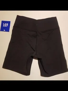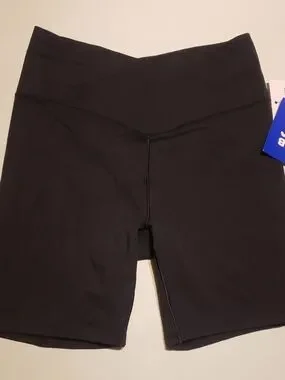 Sleek black bike shorts with a flattering V-front waistband. High-waist design for added support. Smooth, stretchy fabric for easy movement. Minimal seams for a clean look.