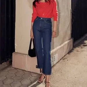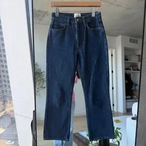Sezane Laurence Straight Leg Jean Trousers. Women's Size FR 34 = US 2. Features straight leg with ankle cropped length, high waisted, dark blue denim wash, zipper fly, 100% cotton fabric. Great used condition, no notable flaws.