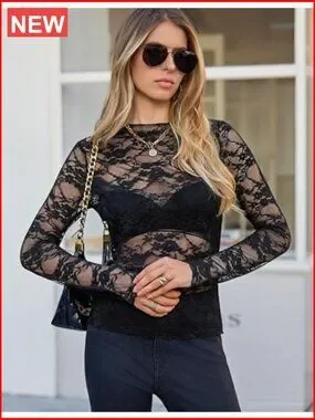 Long Sleeve Lace Top Sheer Mesh T-Shirt Y2K Style