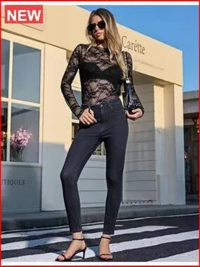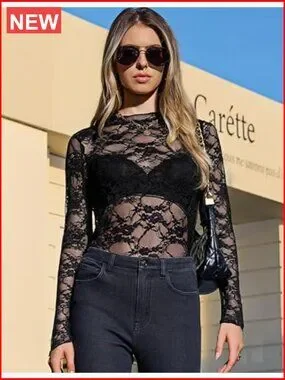 A chic, sheer mesh top featuring delicate lace embroidery and a boat neckline. Designed with a slim fit for a modern, elegant look that's perfect for creating versatile outfits from day to night.