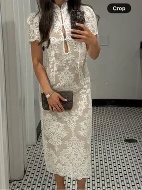Stone Cold Fox midi skirt with ornate cream lace overlay. Sheer lace panels create a delicate, feminine look. Slim, refined silhouette suited for dressy occasions. Pairs well with simple tops or a tailored blazer.
