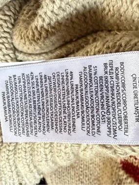 Soft cream cable knit sweater. Features navy woven Polo Ralph Lauren label. Cozy textured knit. Classic brand detailing.