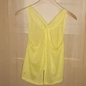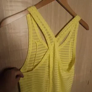 Zyia women’s bright yellow striped open back tank top medium. Gently used condition. Measurements are: 23 ½" from shoulder to shortest part of hem, and 18” from armpit to armpit.