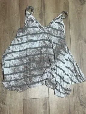 Relaxed striped tank with v-neck. Thin straps with gathered ring detail. Lightweight, breezy fit for casual wear.